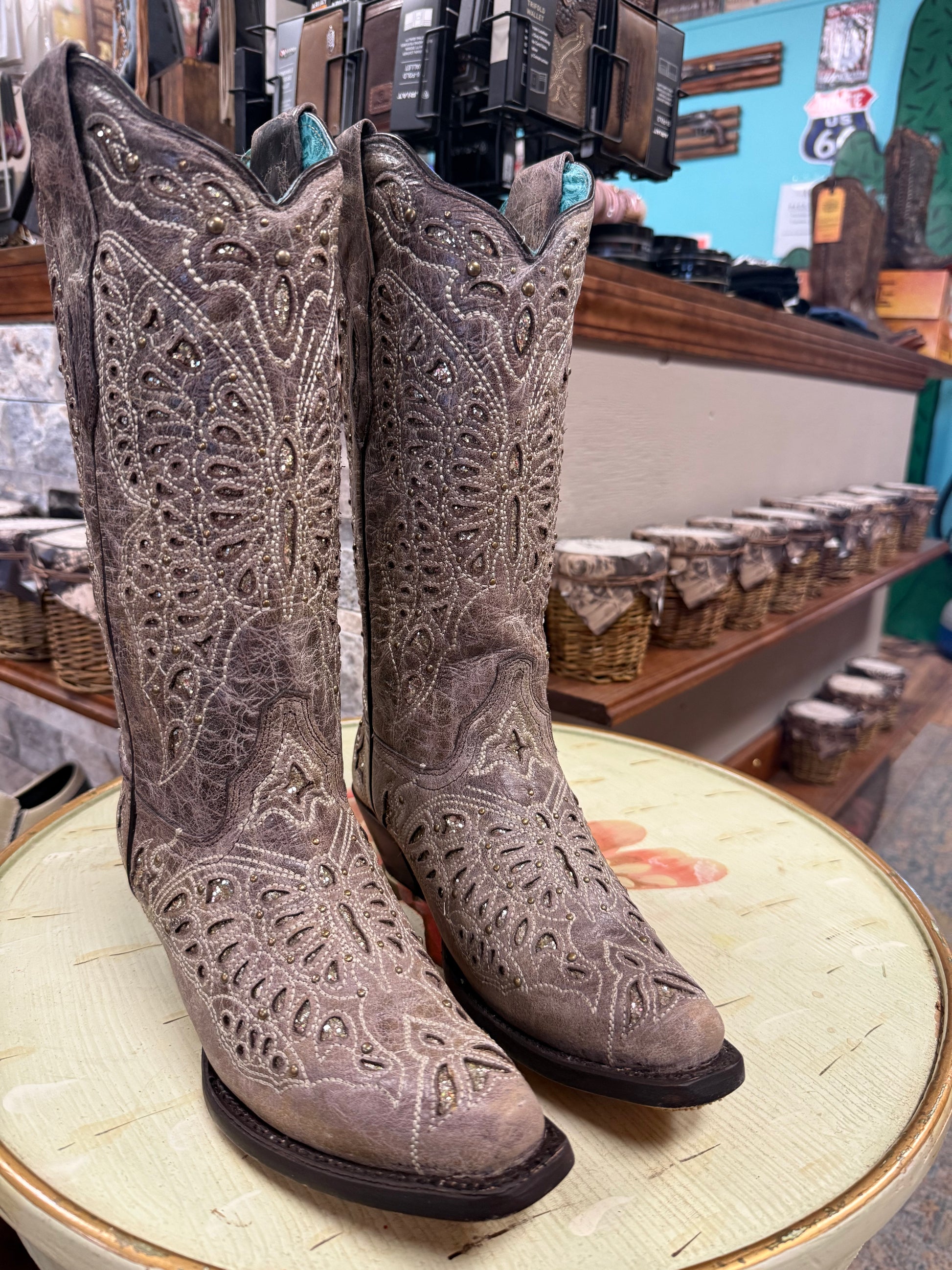 Flirty and fun, this Women’s Corral Boot is a must-have for your western wardrobe. These snip toe boots feature champagne glitter cutouts in a butterfly shape. A charming look for special occasions, date night, or even a western wedding. The silhouette of this cowgirl boot features a scalloped collar and a 2” riding heel.